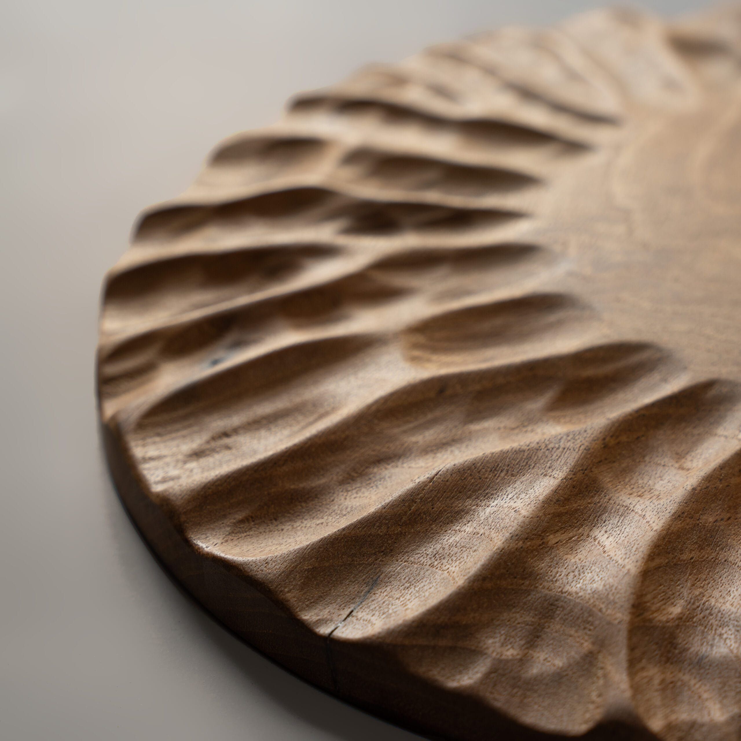 Στρογγυλή, χειροποίητη ξύλινη πιατέλα με σκαλιστές αυλακώσεις περιμετρικά.