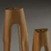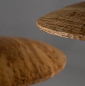 Χειροποίητο φωτιστικό από ξύλο, με δύο λεπτά, κυρτά στοιχεία που «αιωρούνται» το ένα πάνω από το άλλο.