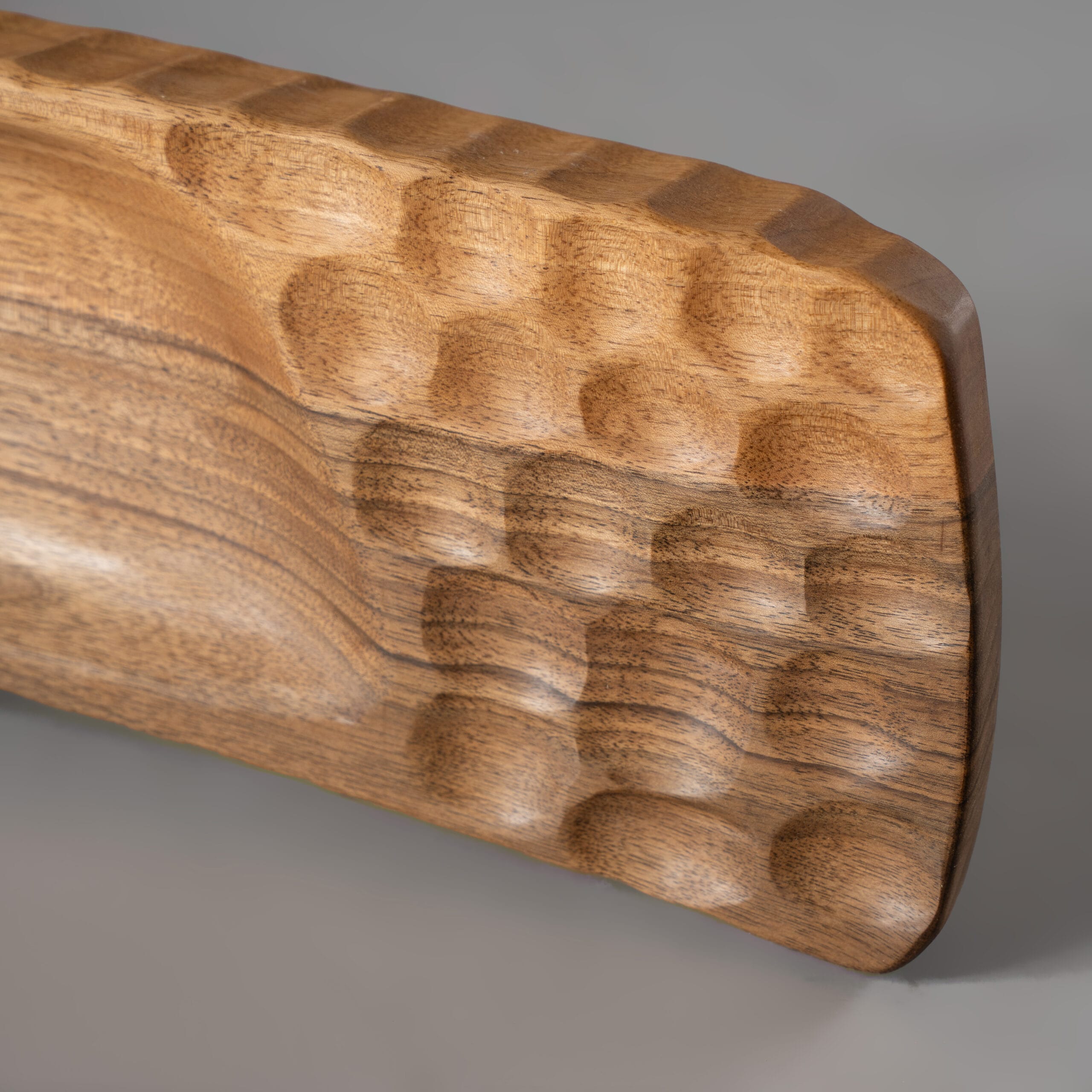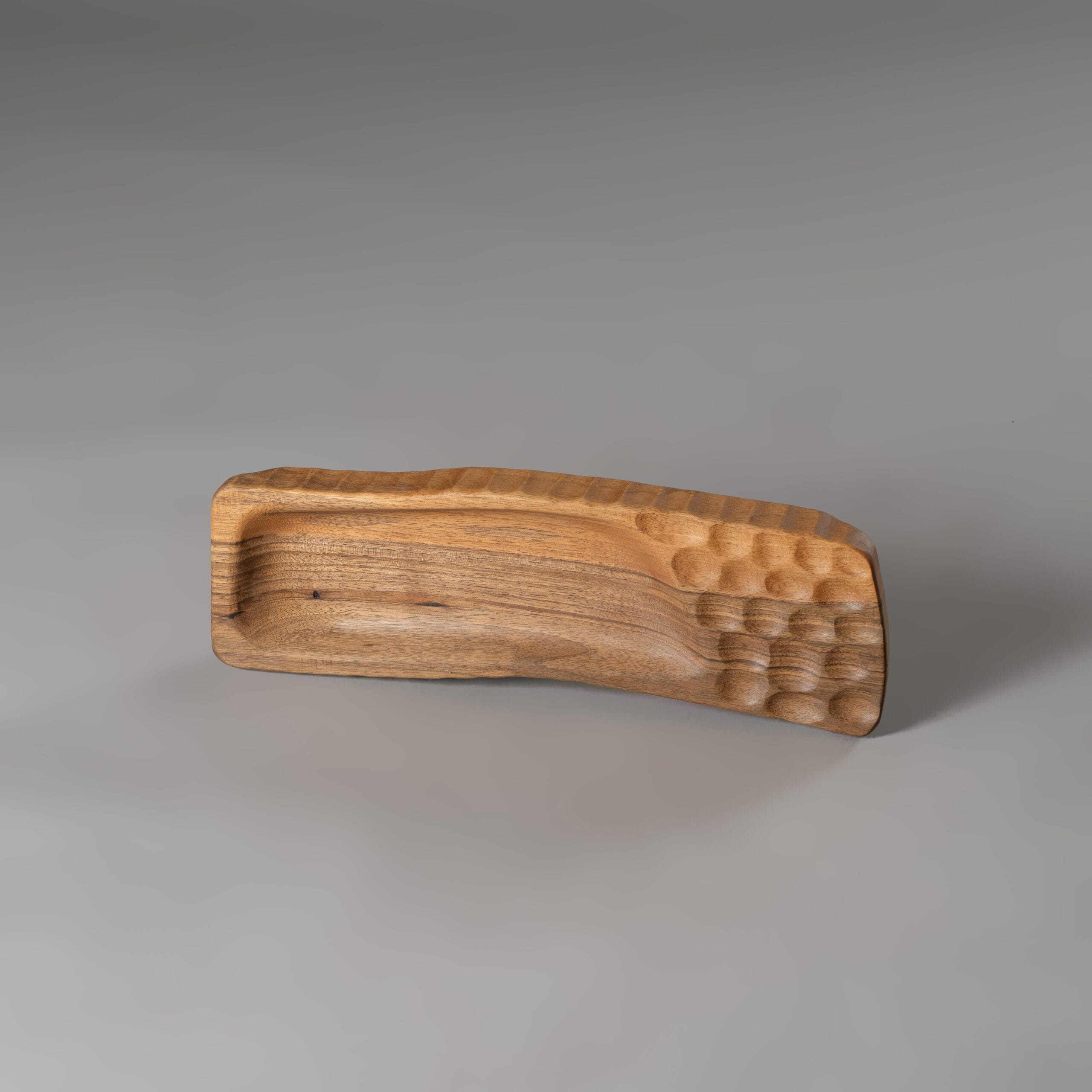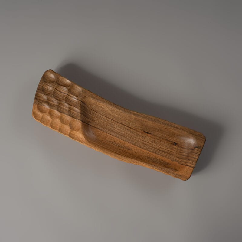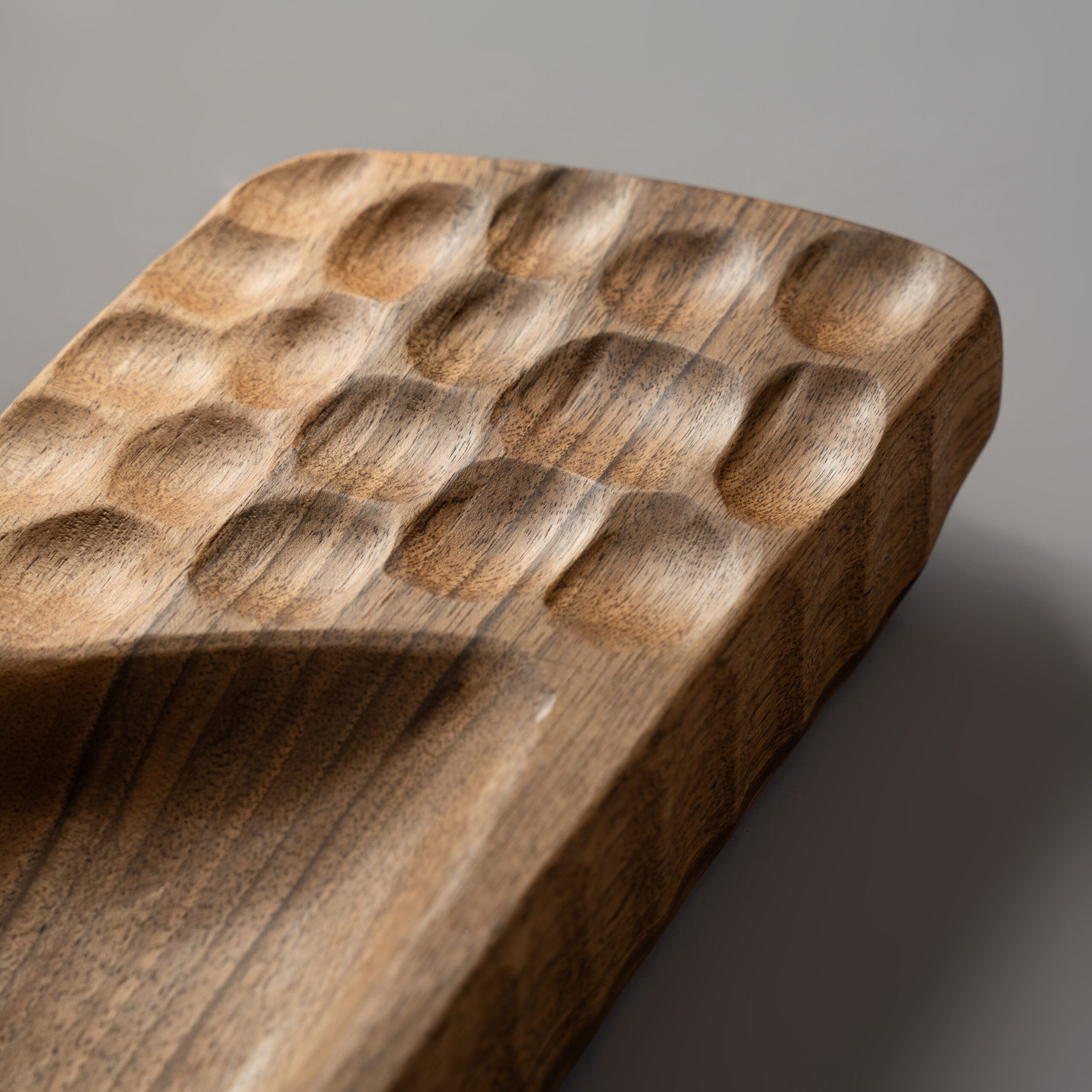 KINAROS, an elongated, handmade tray made of natural wood, with an organic shape and carved texture at one end.