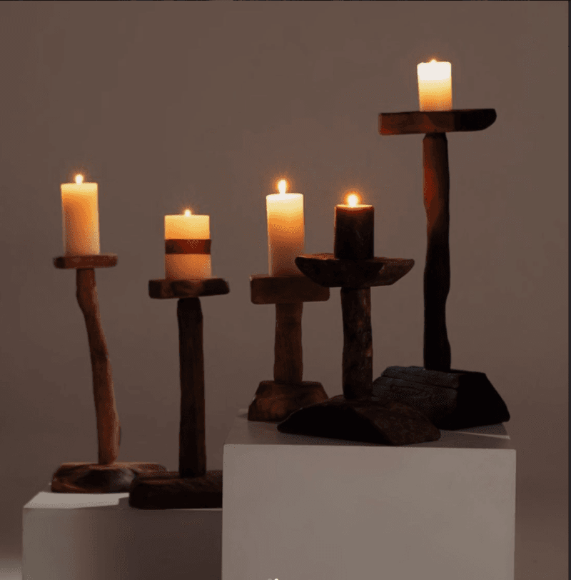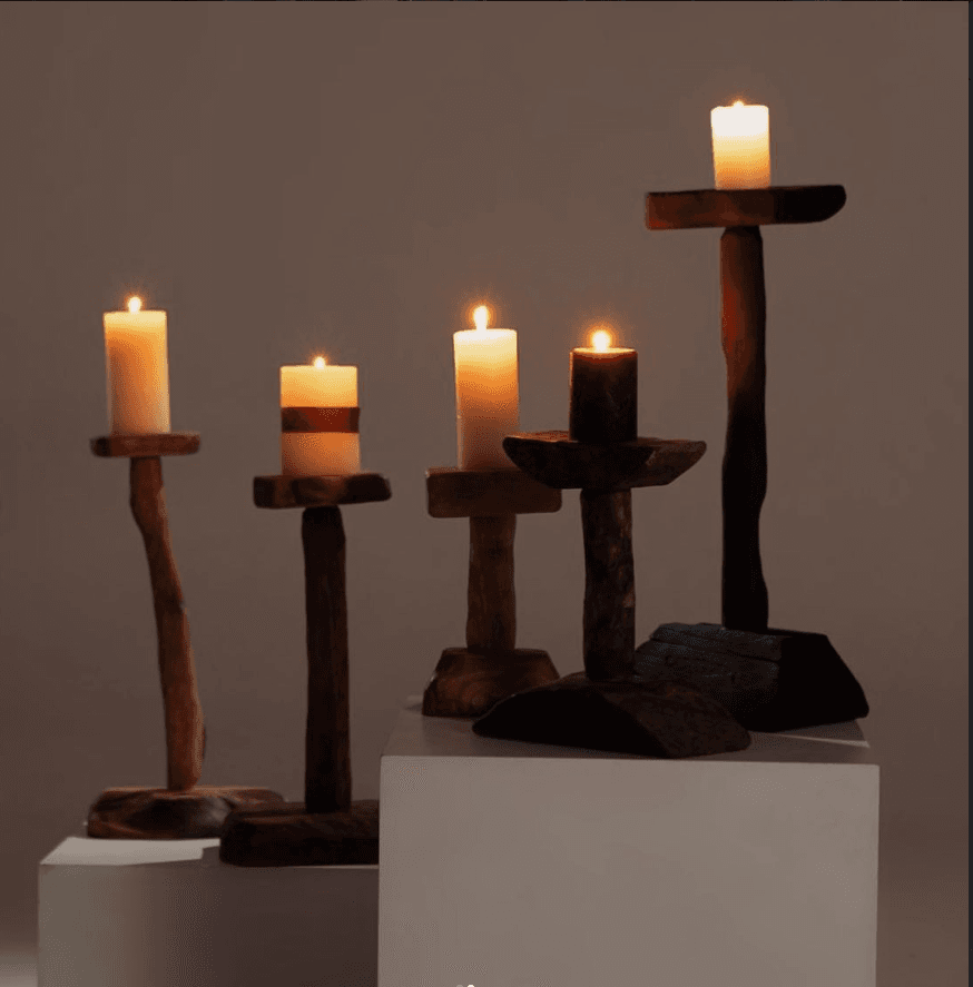 Χειροποίητα ξύλινα κηροπήγια με αυθεντικό, φυσικό χαρακτήρα. Κάθε κομμάτι είναι σκαλισμένο από μασίφ ξύλο, διατηρώντας τα οργανικά σχήματα και τις ατέλειες του υλικού που το κάνουν μοναδικό. Η ρουστίκ αισθητική τους, σε συνδυασμό με τις καθαρές γραμμές και τη σταθερή βάση, δημιουργεί μια ζεστή και γήινη ατμόσφαιρα σε κάθε χώρο.