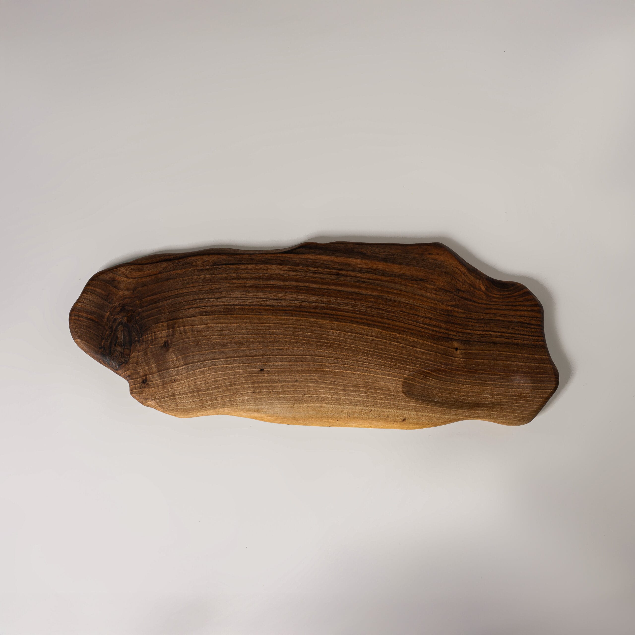 Απλός, χειροποίητος δίσκος OLIS από φυσικό ξύλο, με ακανόνιστο σχήμα που ακολουθεί τη μορφή του κορμού. Η επιφάνειά του είναι λεία, με εμφανή και έντονα νερά, σε ζεστούς καφέ τόνους.