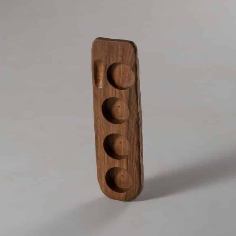 V WOODS designed PSERIMOS a custom-made work with four functional carved slots and handles on each side. An entirely hand-carved piece with primitive minimal aesthetic. Excellent decorative element.